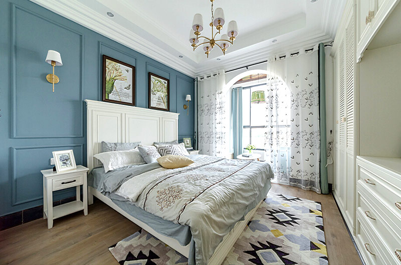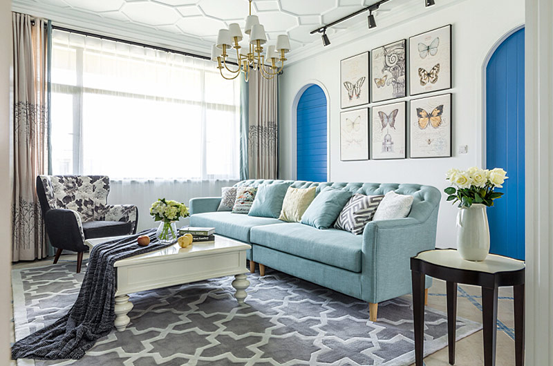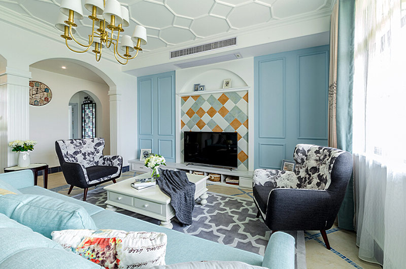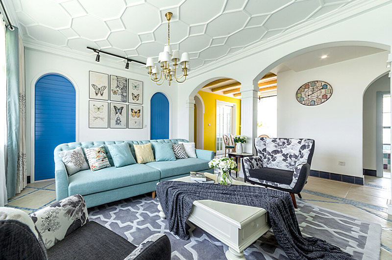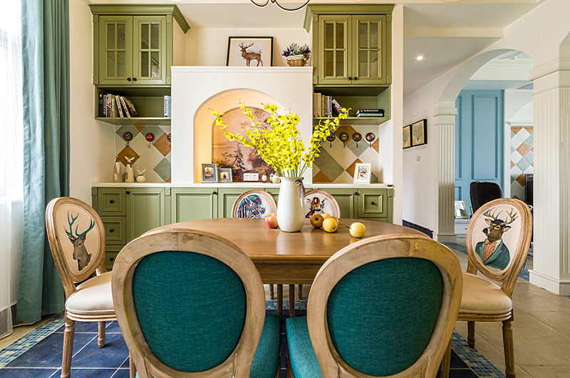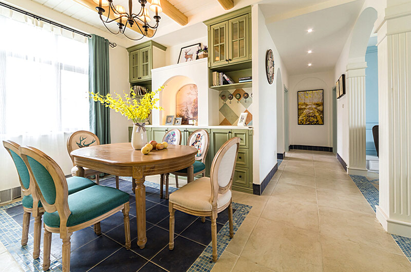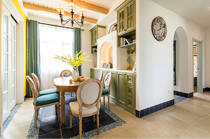 本案中的130平米的三居室整體采用了地中海風格裝修,并在清爽愜意的空間氛圍中融入了田園風格的清新自然感,在色彩的選擇上也盡量的以清爽的藍色和富有活力的明黃色為主,并在餐廳中運用了象征著森林的墨綠色,為空間帶來靜謐之感的同時也增添了幾分自然的氣息。