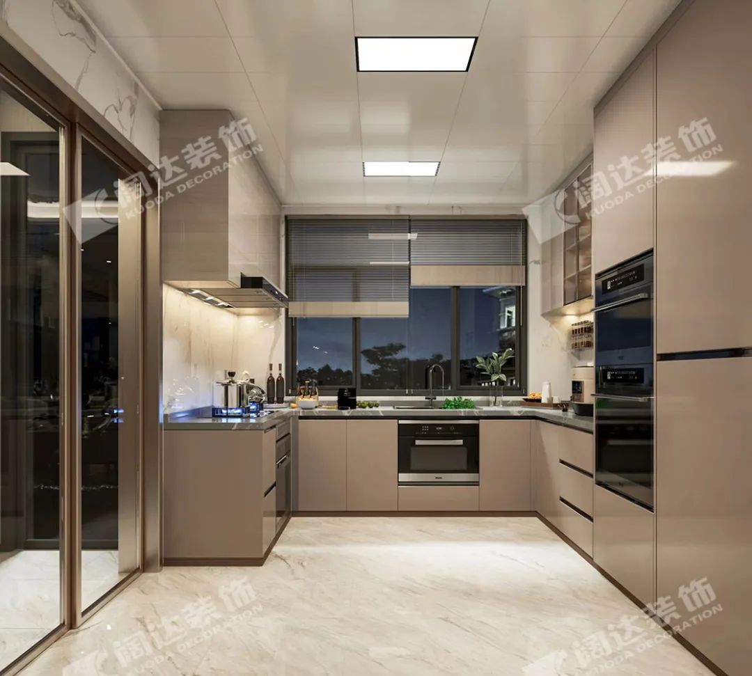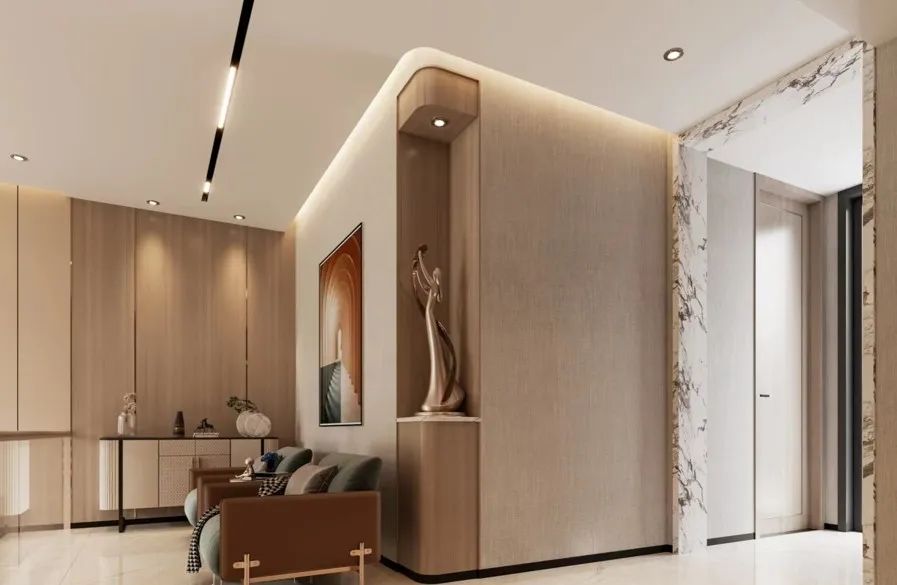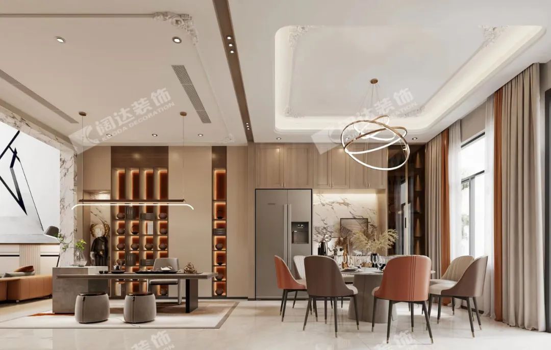 客廳溫暖明亮,經濟耐看是本案的主要需求之一,剔除了法式復雜的線形后,融入了現代溫暖明亮的暖色系風格,材質上搭配巖板,給予了視覺上的沖擊力,成為業主期待的理想之家。