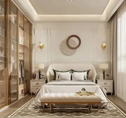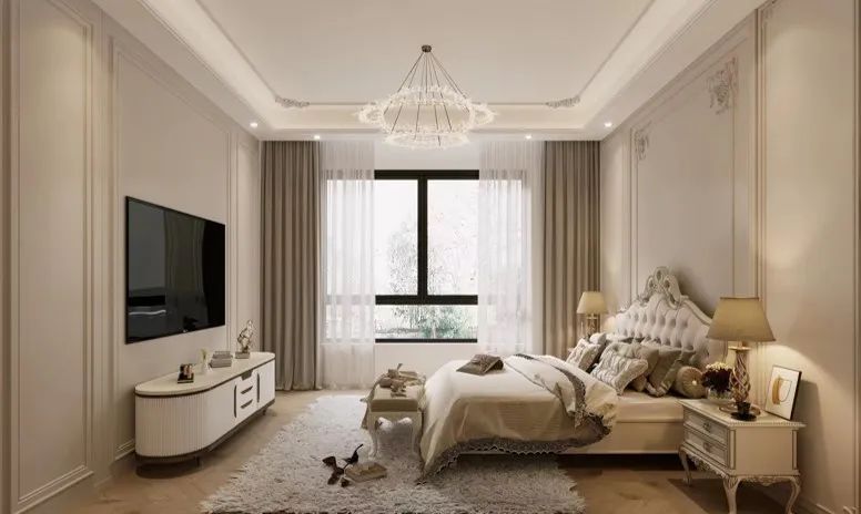主人房:亞麻色的墻面因為石膏線的加入增加了不少立體度,搭配低飽和度顏色,也能打造出不一樣的視覺感受,適度加一點角花裝飾,提升層次感的同時,盡顯優雅。