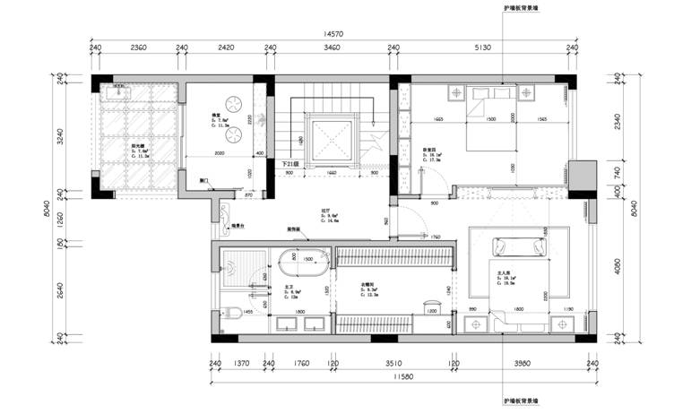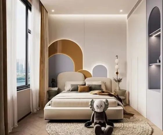 二樓:法式輕奢的主臥地面鋪木地板,定義靜謐舒適的氛圍,點綴金屬元素的壁燈和柜子,質感和輕奢氣息油然而生。孩子的臥室則更加童趣。