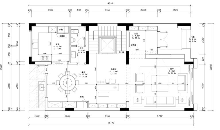 一樓通過改造擴大了餐廳面積,同時新設了茶區的功能。色彩和材質的搭配讓整個空間更明亮干凈。